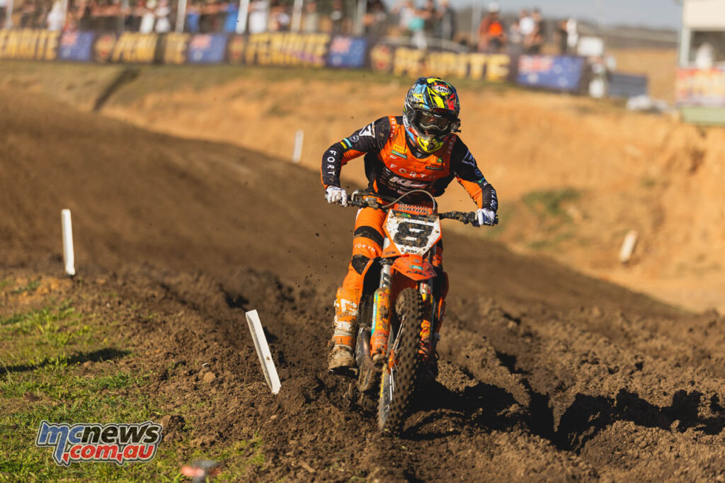 MX2 produced one of the key stories of the round. Kayd Kingsford converted a moto-one win and second in the final outing into his first overall in the class, while teammate Alex Larwood stormed back from a troubled opening race to win moto two.