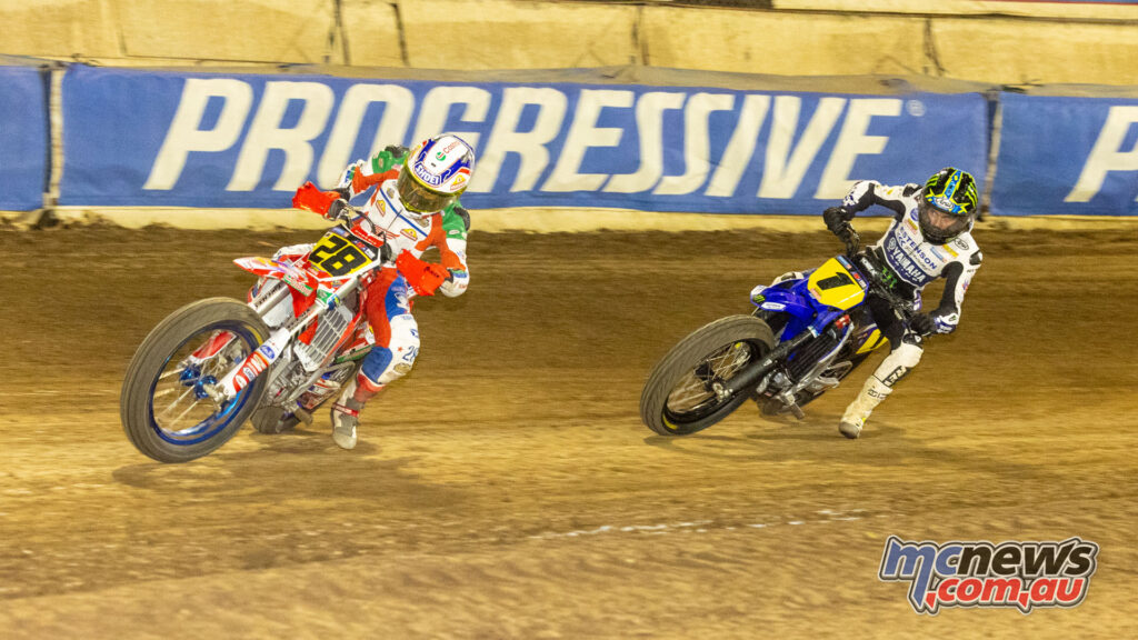 Kage Tadman and Tom Drane – 2026 American Flat Track – Round Three – Ventura Short Track – Image by Tim LesterJared Lowe was the early leader after taking the holeshot, but Tadman soon worked around the outside to take control. Drane then forced his way past Lowe and immediately went after the Honda rider, repeatedly threatening on the inside as Tadman’s preferred outside line left a narrow opening. With a little over a minute remaining, Drane finally made a move stick, only for Tadman to square the corner off, cross back underneath and reclaim the lead almost immediately.