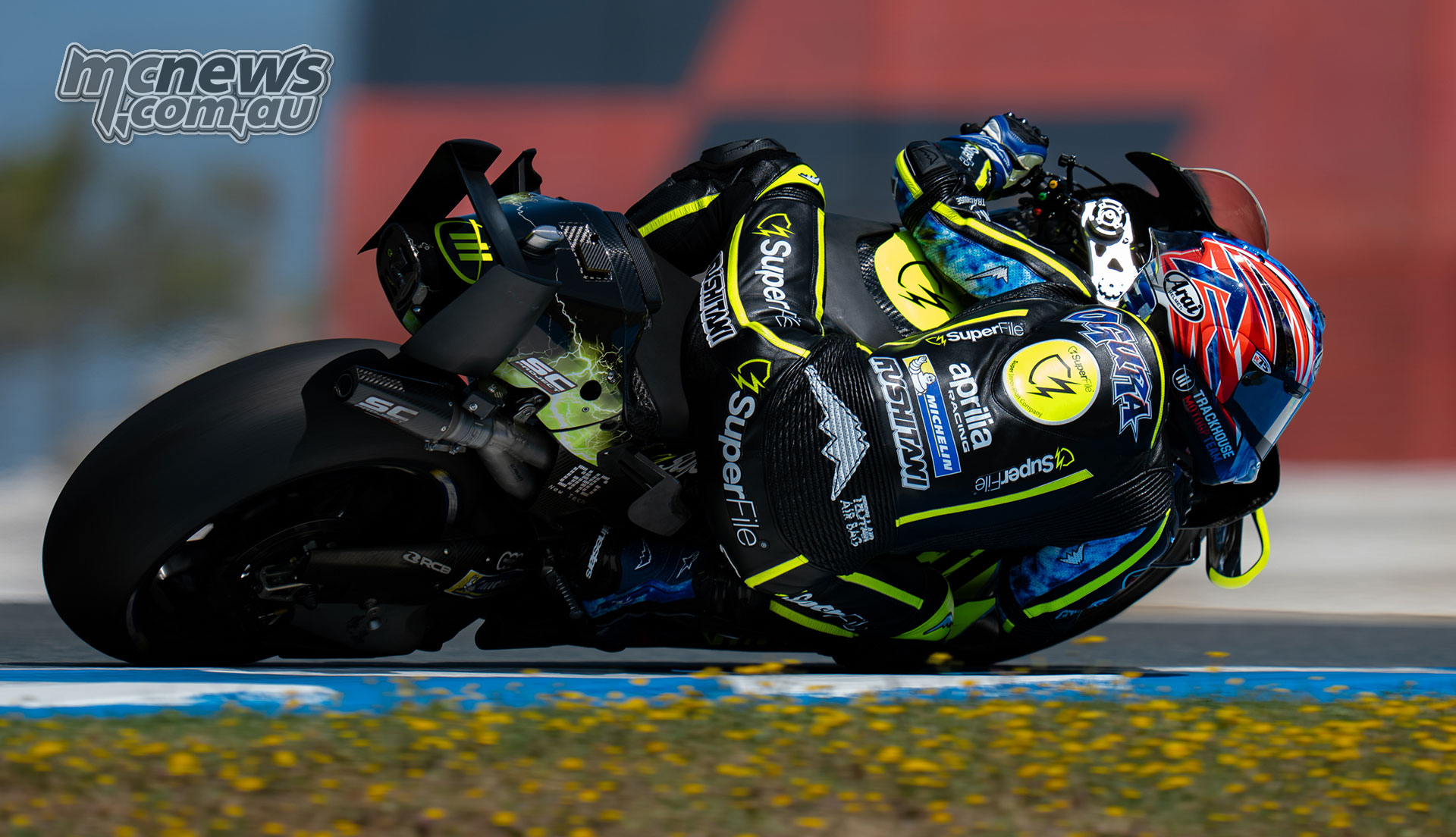 Ai Ogura banked over through a right-hander on the Trackhouse Aprilia at Jerez.Giovanni Mattarollo – Ogura Crew Chief