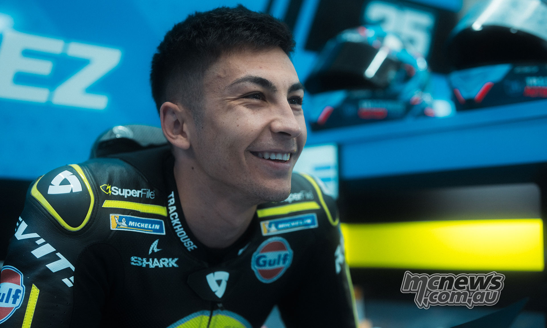 Raúl Fernández smiles in the garage after another productive Trackhouse Aprilia run.Noe Herrera – Fernandez Crew Chief