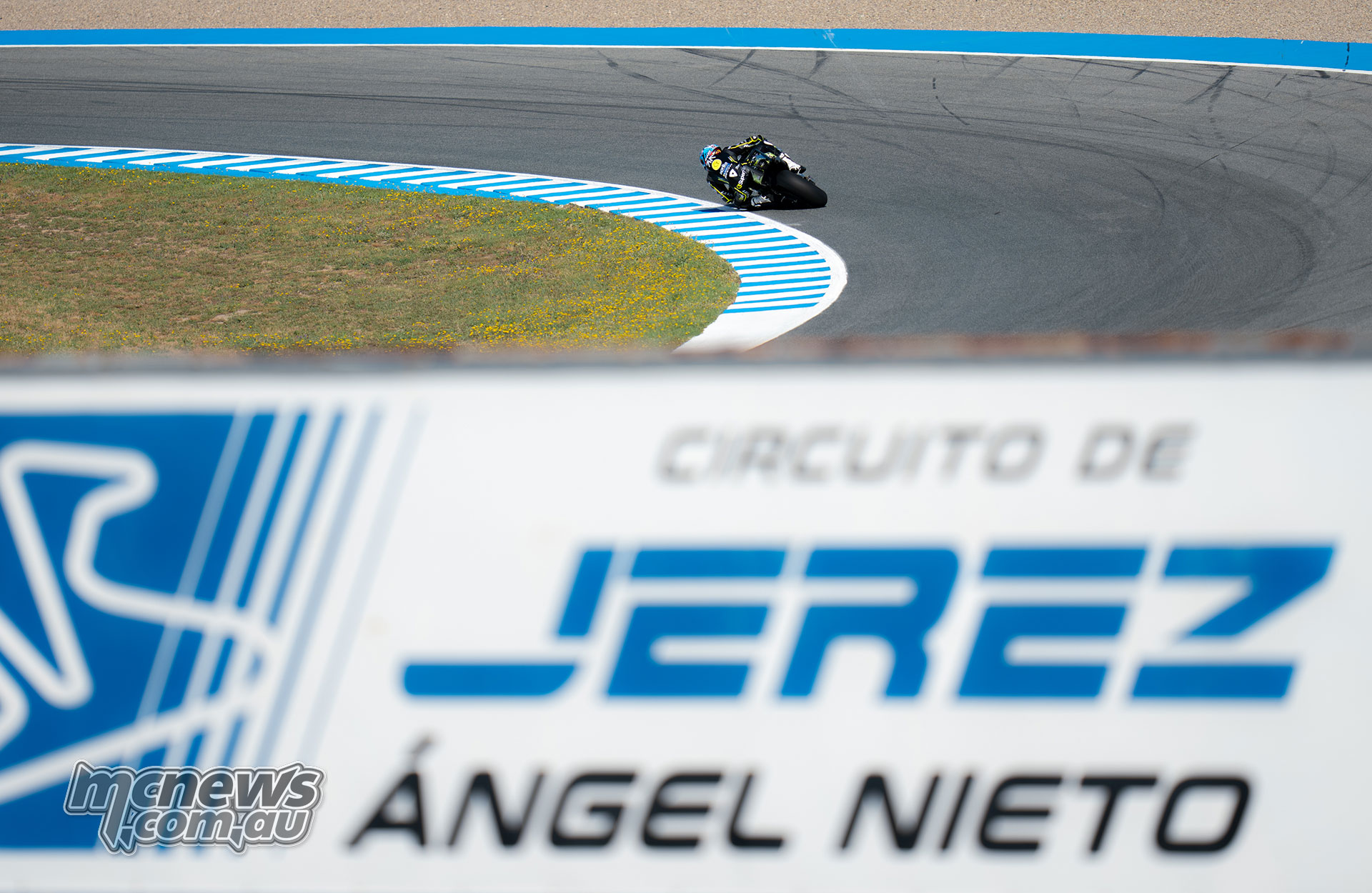 Raúl Fernández banked over from behind through a flowing left-hander at Jerez.Pedro Acosta – P5