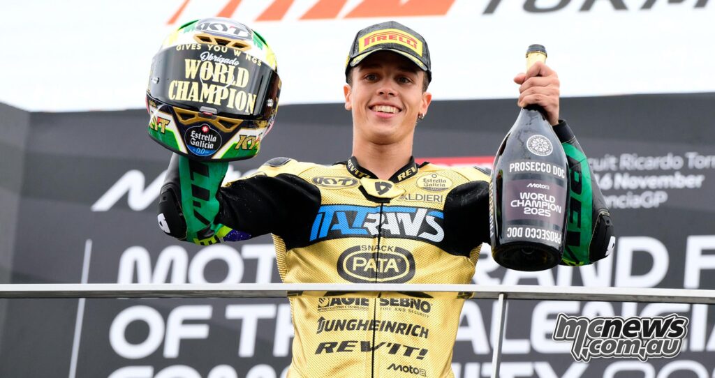 21-year-old Diogo Moreira from Sao Paolo won the Moto2 World Championship ahead of his MotoGP move in 2026 with Yamaha.At the front, Izan Guevara (BLUCRU Pramac Yamaha Moto2) claimed his first Moto2 victory, becoming the 11th different winner of the season. Daniel Holgado (CFMOTO Inde Aspar Team) finished second, while Iván Ortolá (QJMotor – FRINSA – MSI) charged forward to claim his first Moto2 podium in third.