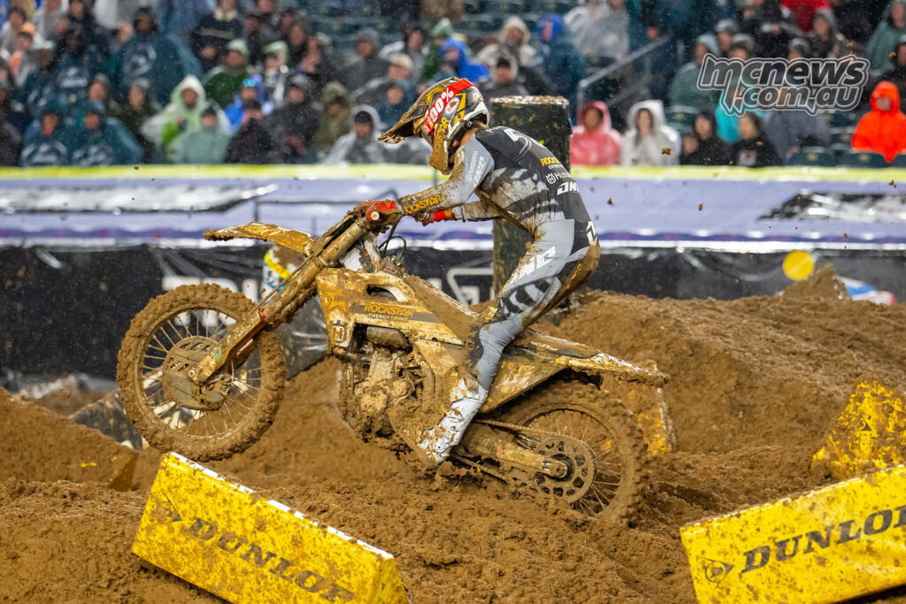 Hunter Lawrence navigates the soaked Philadelphia circuit during the 450SX Main Event.Malcolm Stewart – P11