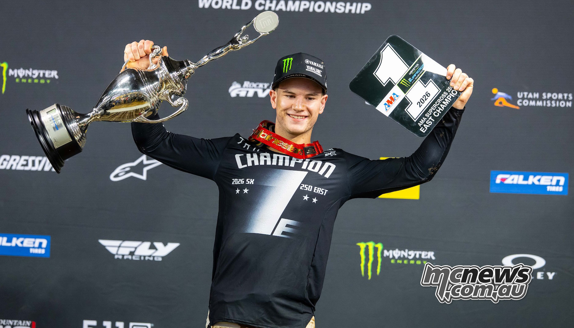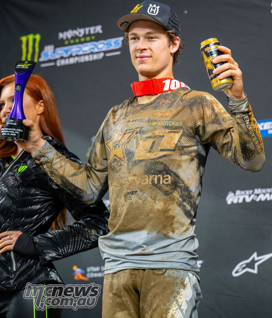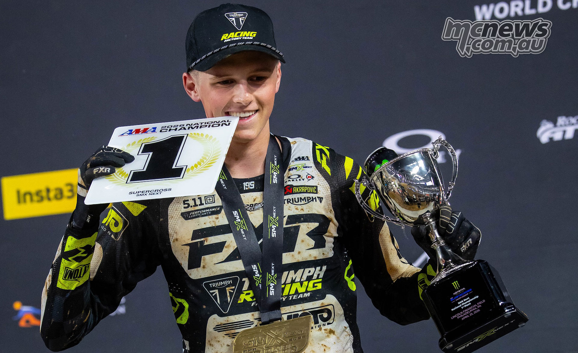 Deacon Denno celebrates his SMX Next National Championship victory for Triumph in Philadelphia.Australian prospect Kayden Minear continued his solid form with a seventh-place finish, navigating the conditions well to remain inside the top ten.