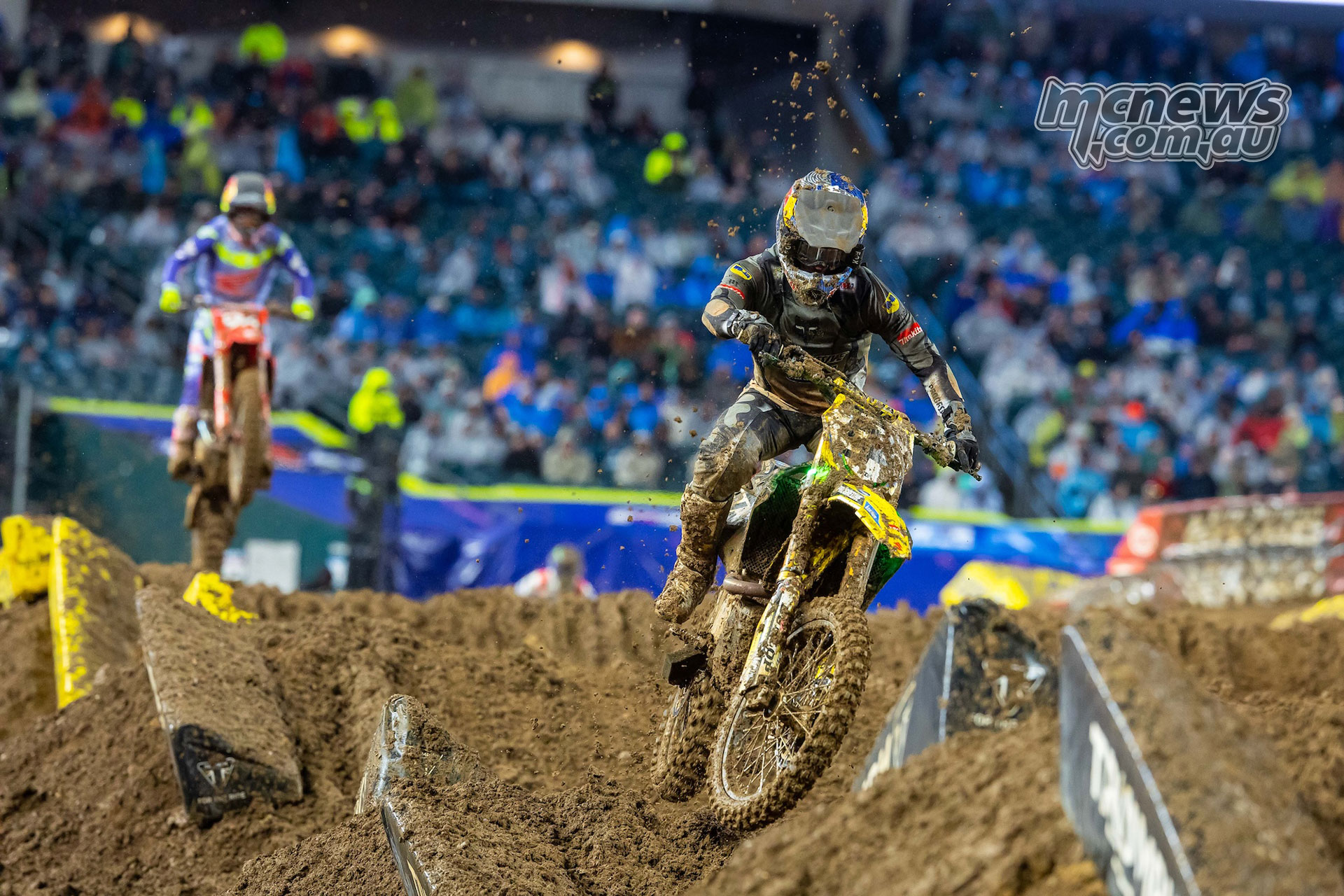 Ken Roczen leads Hunter Lawrence during the 450SX Main Event in Philadelphia.Cooper Webb applied pressure in the latter stages but ultimately came up just 2.4 seconds short, while Hunter Lawrence salvaged a valuable podium in third after an eventful race that saw him unable to consistently challenge the leading pair.