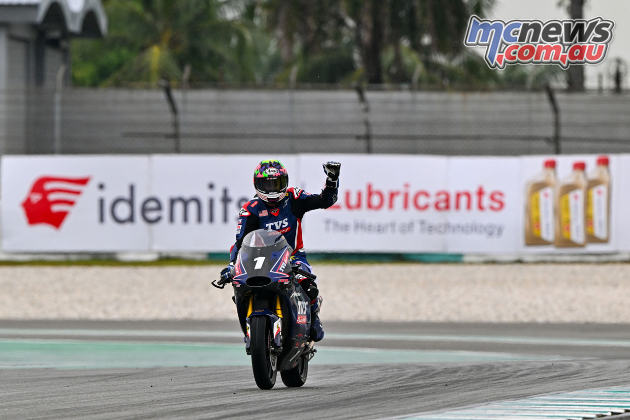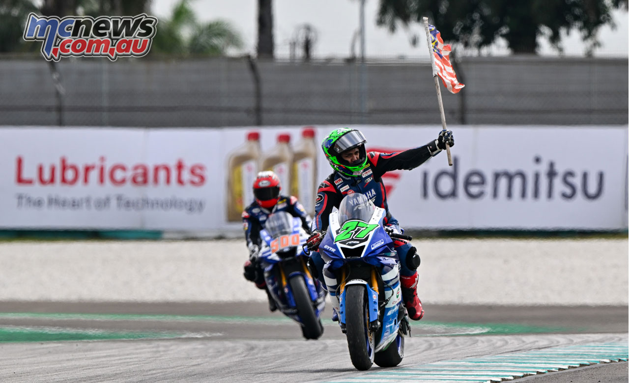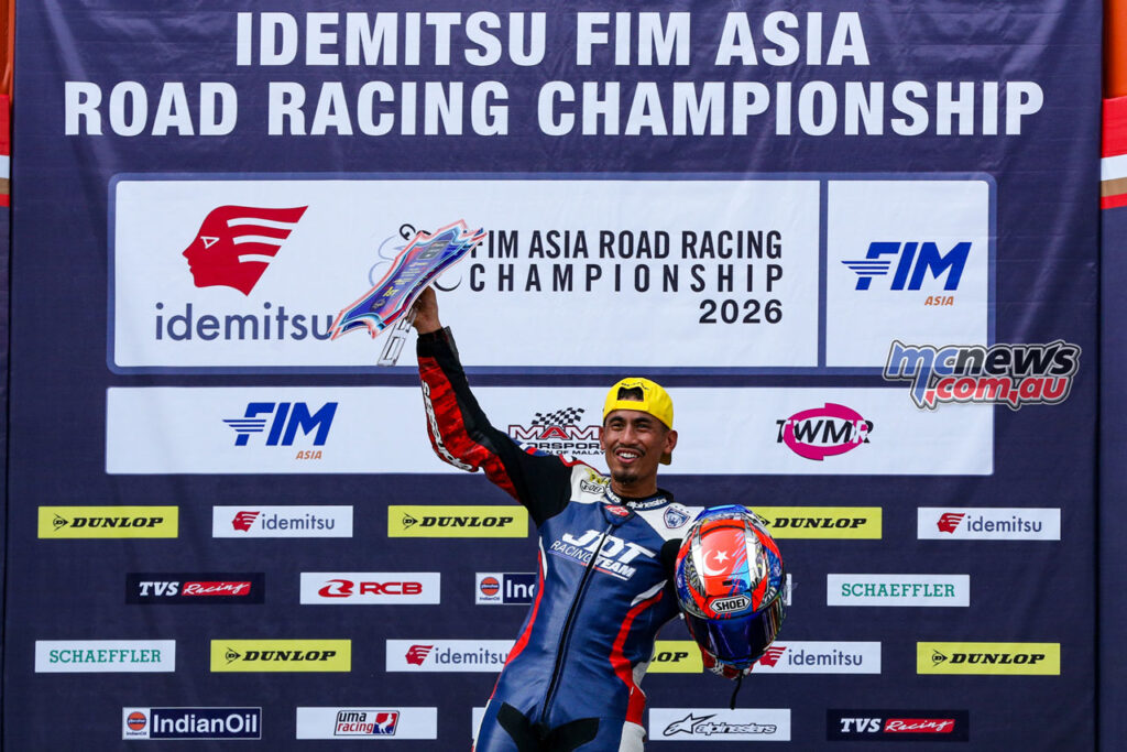 2026 ARRC Round One – Sepang, Malaysia – Hafizh Syahrin Abdullah celebrating the race one victoryRace Two followed a similar pattern at the front. Syahrin again controlled the tempo, again had the pace to break the field, and again left the rest to sort out the minor placings behind him. Abe and Andi resumed their battle from the previous day, with Andi briefly appearing set to lock out a JDT one-two before Abe stole second back by the barest of margins on the run to the flag.