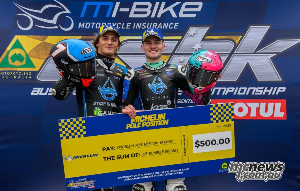Tom Toparis with Crew Chief Glen Richards and mechanic Bryan Hands – Image RbMotoLensImportantly, as Archie McDonald was the top qualifier amongst competitors running under the traditional ASBK Supersport rules, he gets the point for pole position in that category, reducing Mahaffy’s championship lead to 23-points.